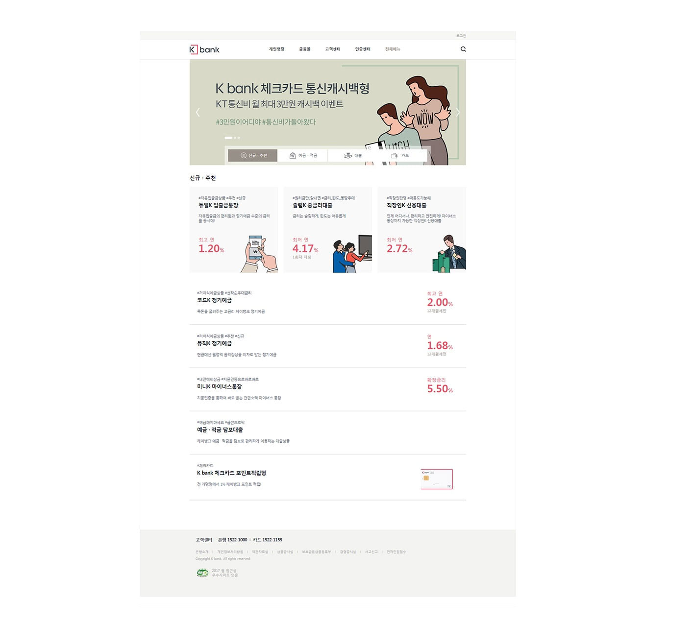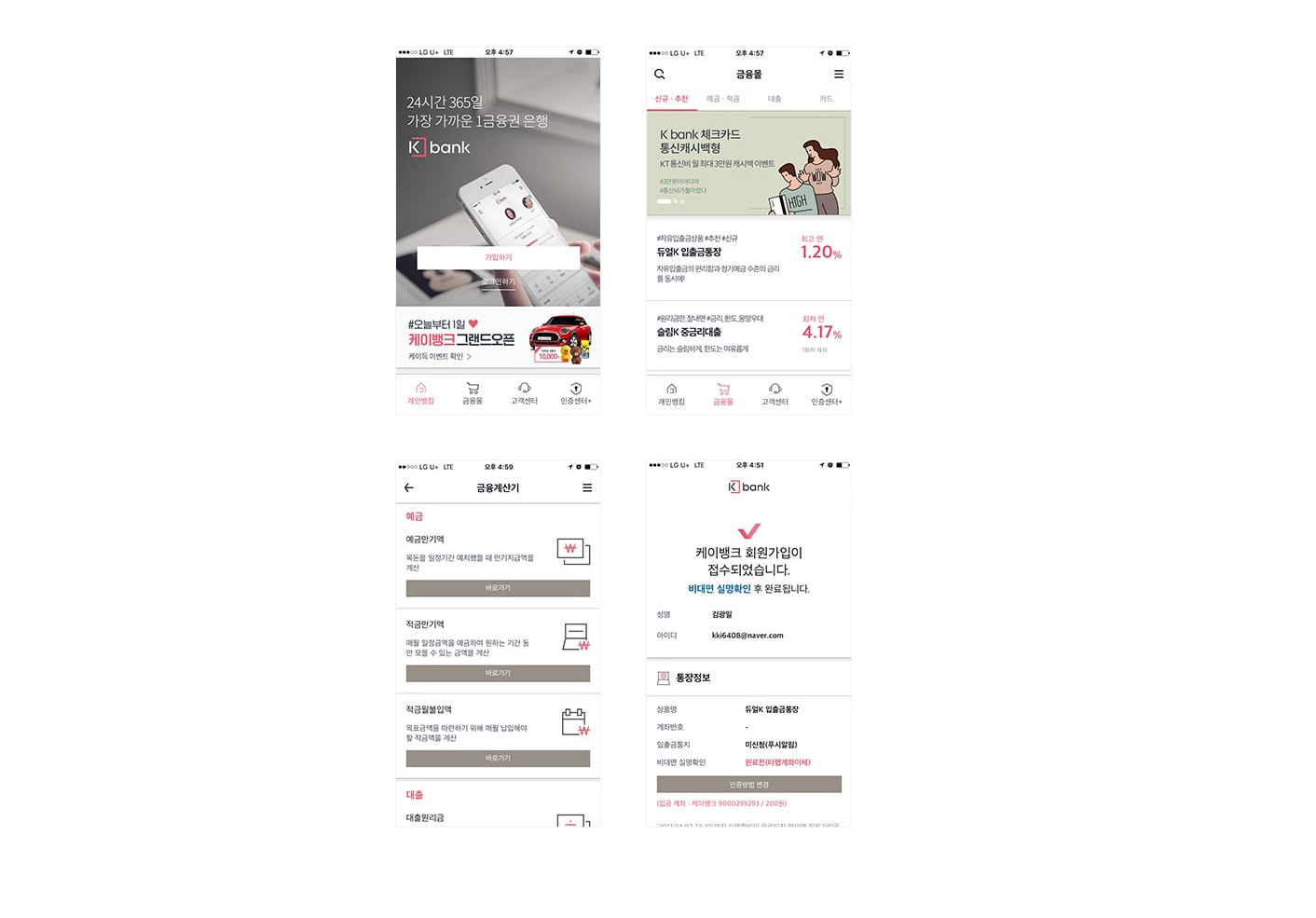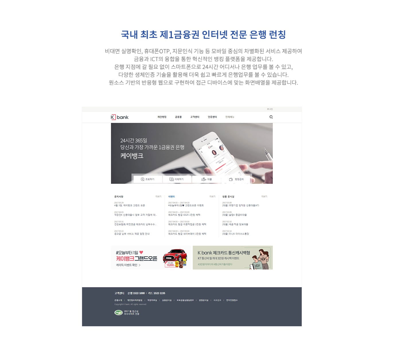 모바일 중심의 차별화 된 서비스를 적용하여 뱅킹 플랫폼 구현하였고, 계좌개설 부터 카드발급, 비대면 실명확인, 보안 매체, 체크카드 발급까지 하나의 프로세스를 통하여 뱅킹 서비스 이용이 가능하도록 신규 런칭