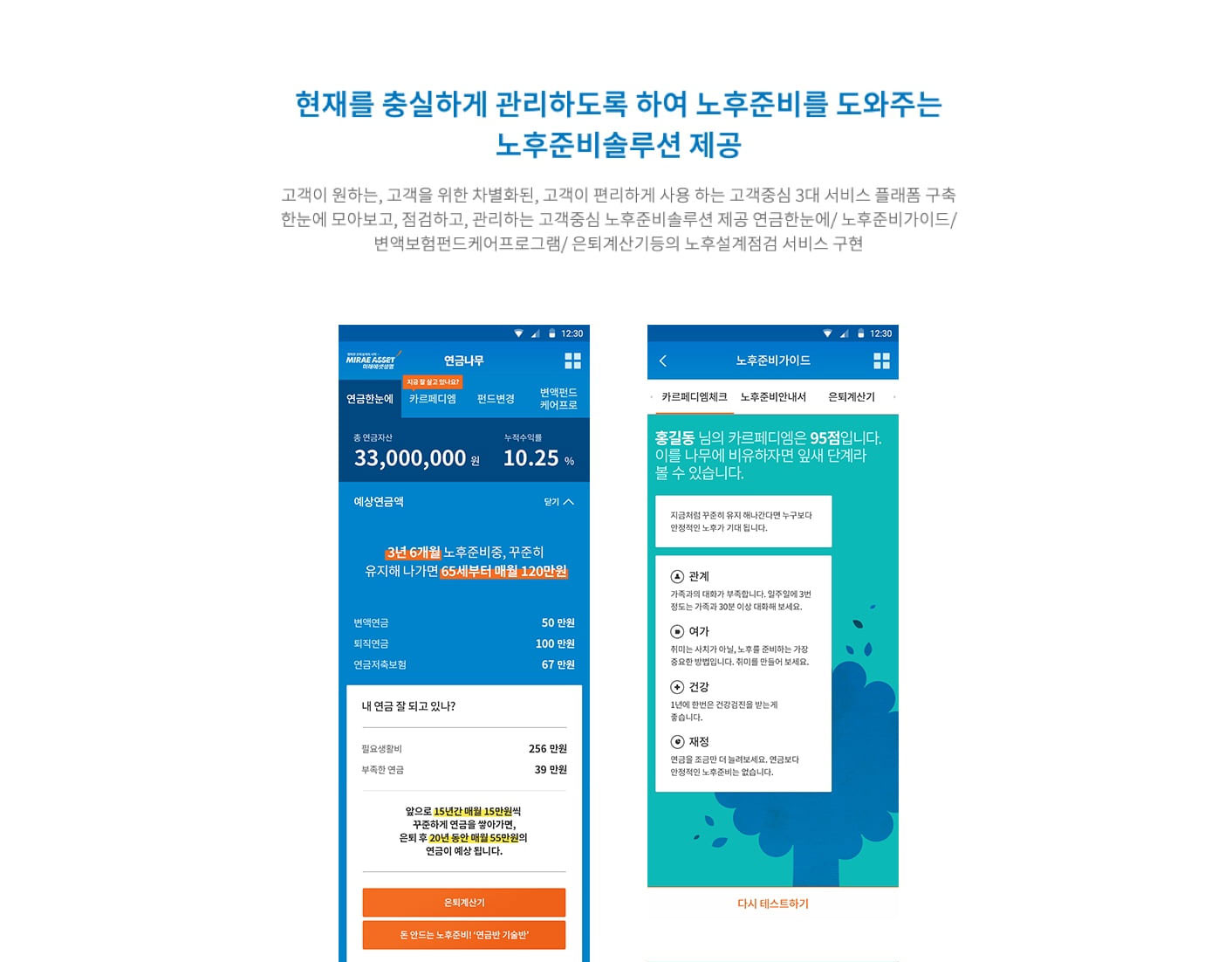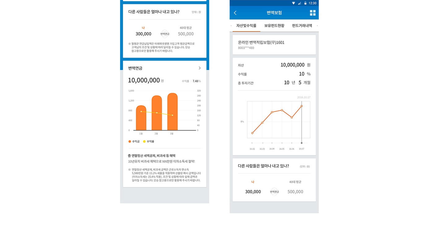 연금 정보를 한눈에 모아서 보여주어 간편하게 점검 하고, 변액연금보험상품을 쉽게 관리할 수 있도록 사용성을 개선하여 구현